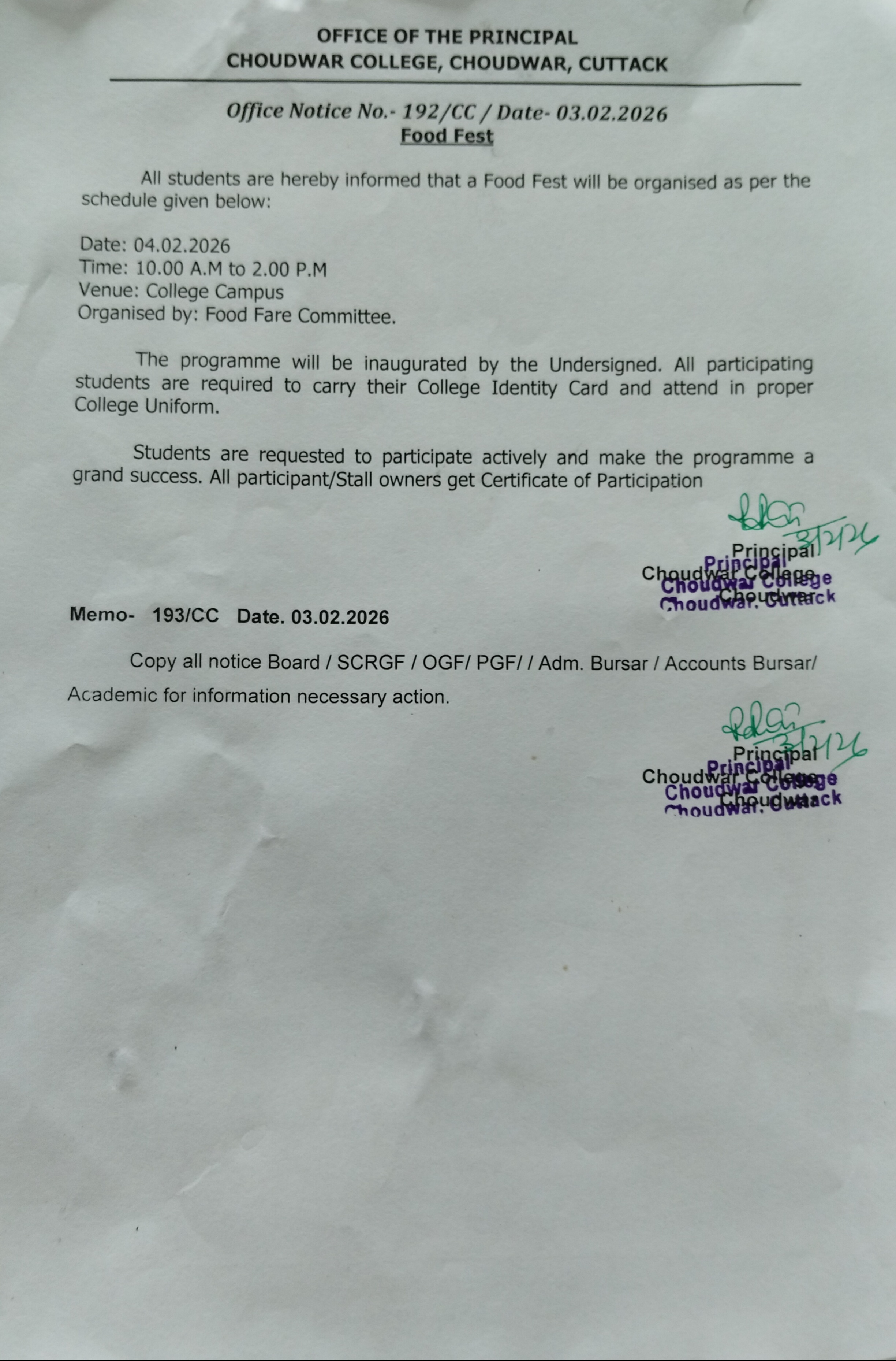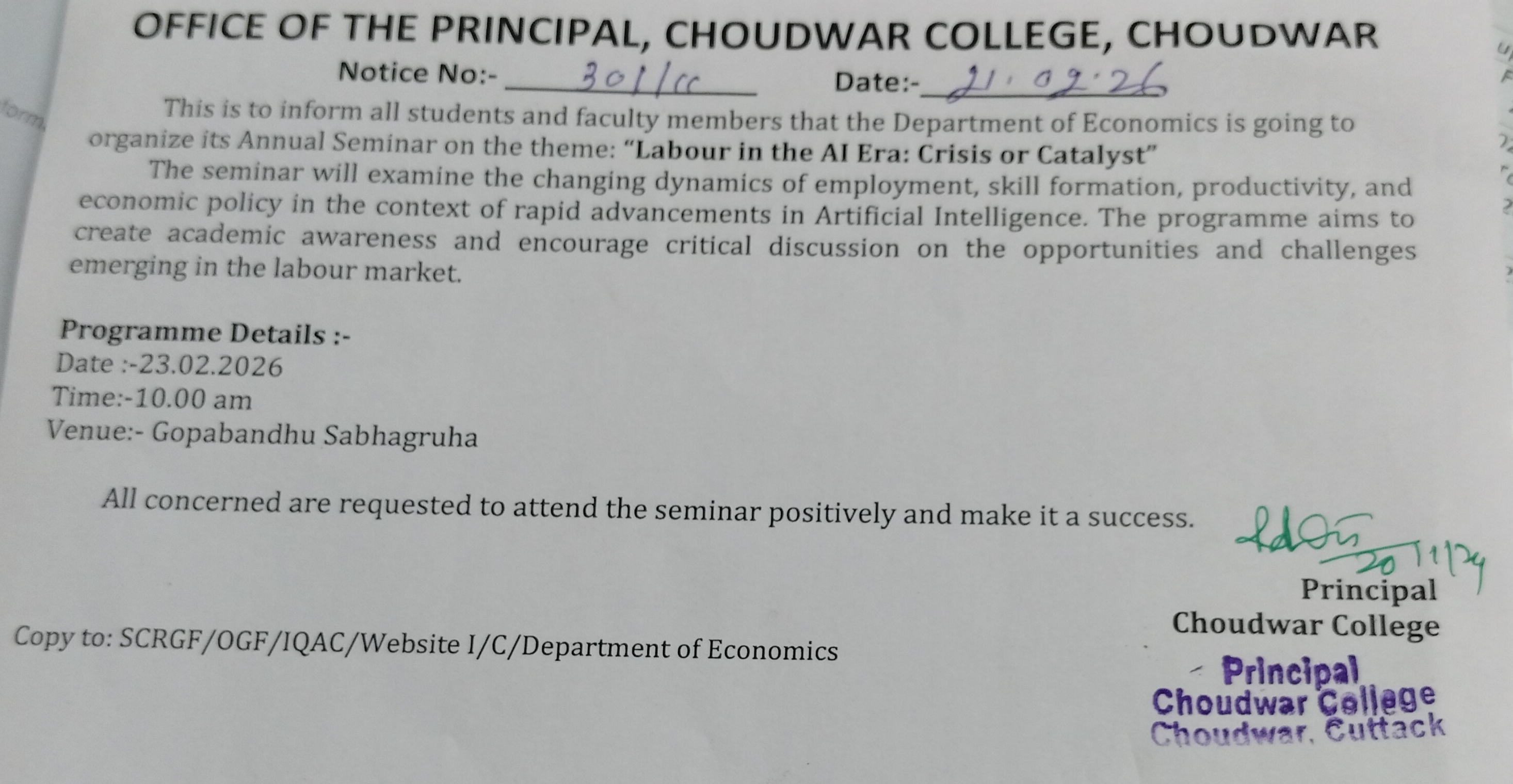 The present Choudwar College is a full-fledged Non-Govt.Degree College with facility for Honours teaching. It has also come under the fold of the direct payment scheme of the Govt. of Orissa since 1984 and the Govt.has been appointing Principals since June 1990.The College has started receiving assistance from the University Grants Commission since September 1994.On the basis of fair conduct of examination Utkal University is pleased to make this college the University Valuation Zone since 1999.